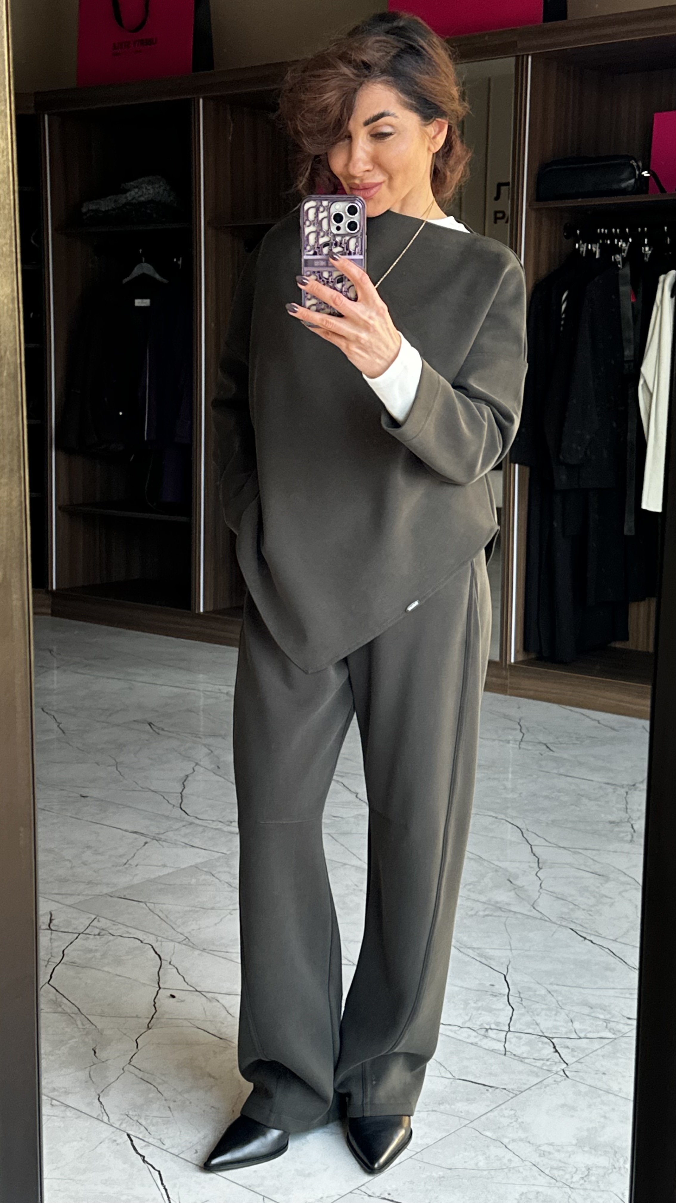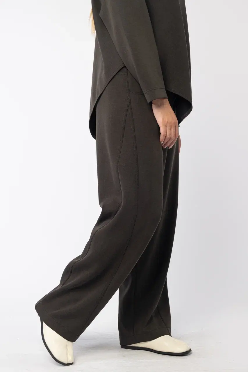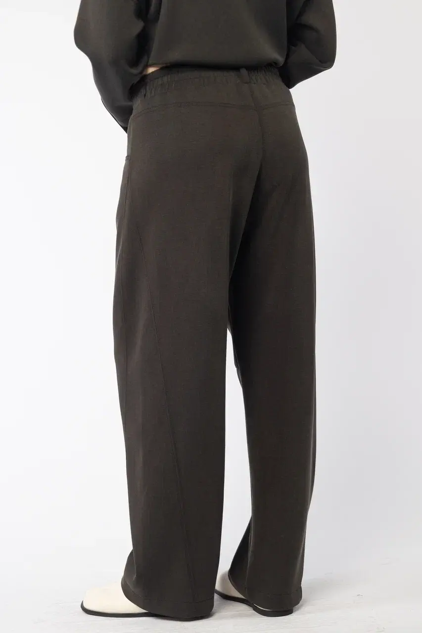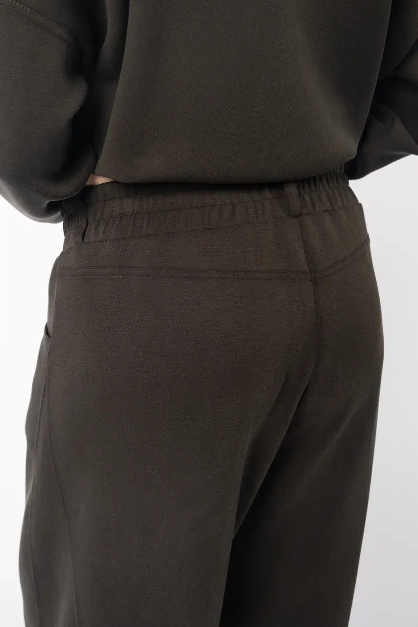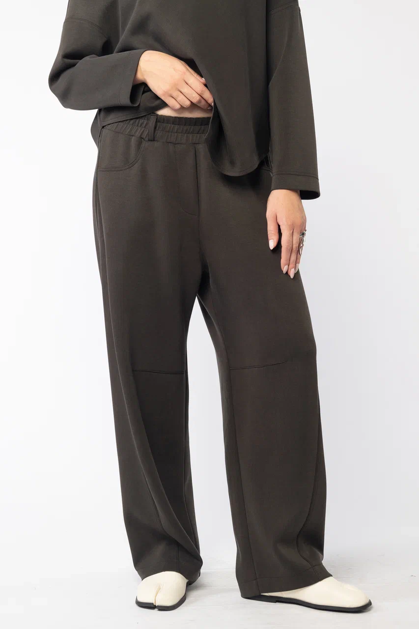 Брюки в полной длине с благородным бархатистым эффектом из премиального трикотажа с большим содержанием купро, имеет благородный бархатистый эффект. Комфортная посадка на резинке, практичные два кармана.