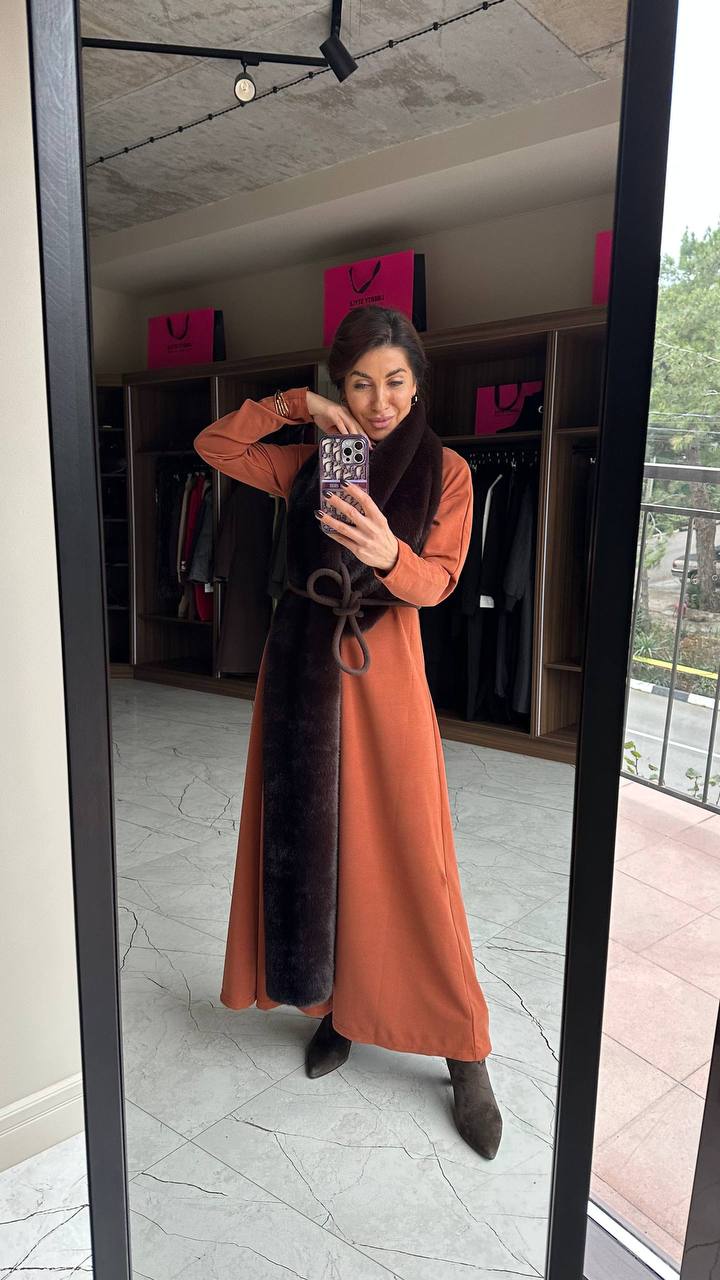 Платье-миди из трикотажного полотна с благородным матовым блеском. Лаконичный А-силуэт с круглой горловиной и скрытыми боковыми карманами обеспечивает безупречную посадку и элегантную простоту.