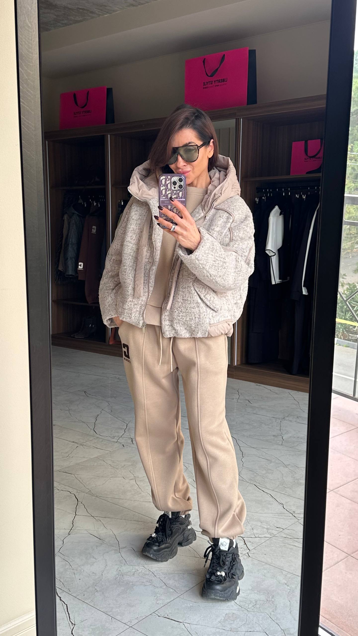 Жакет с капюшоном, по низу резинка. Два боковых кармана.